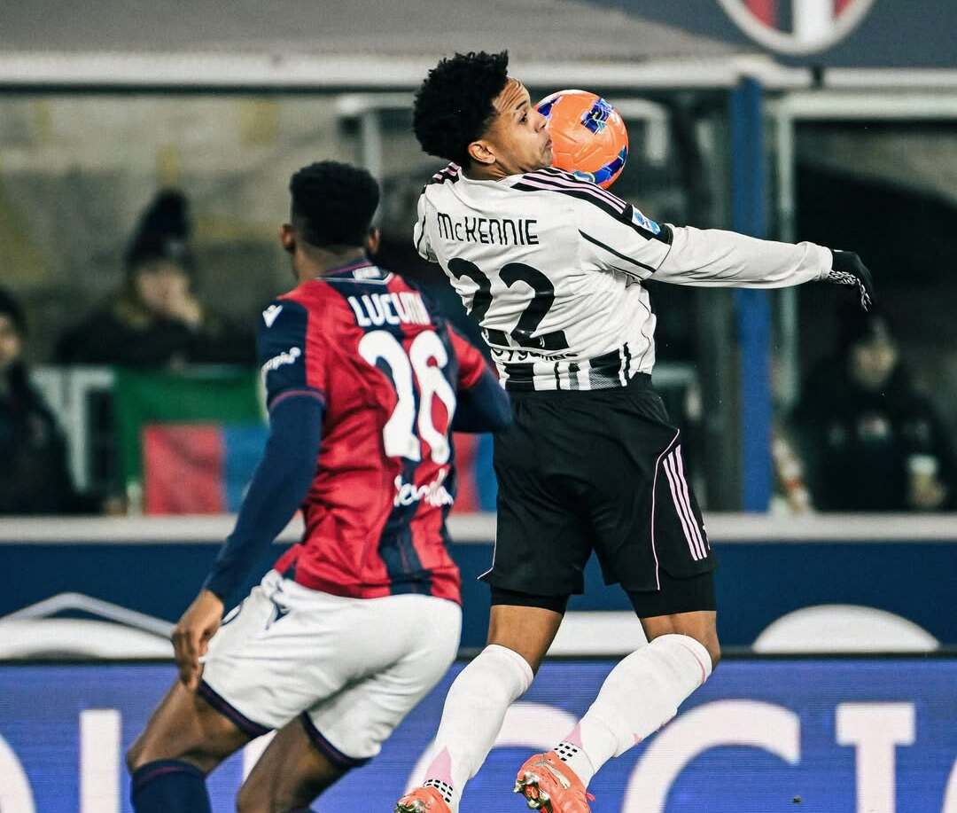 Momen gelandang Juventus, Weston McKennie (kanan), berusaha menghindari kawalan bek Bologna, Jhon Lucumi (kiri). Senin, 15 Desember 2025--Instagram @Juventus