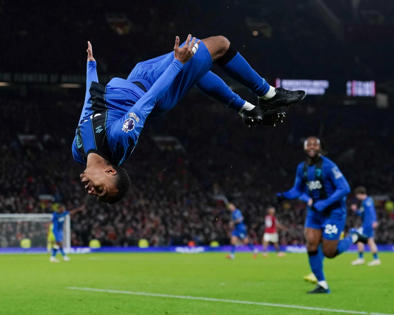 Selebrasi Eli Junior Krupi usai samakan kedudukan bagi Bournemouth lawan Man United (4-4), laga lanjutan Liga Inggris 2025/2026 pekan ke-16, Selasa 16 Desember 2025-Martin Rickett-PA