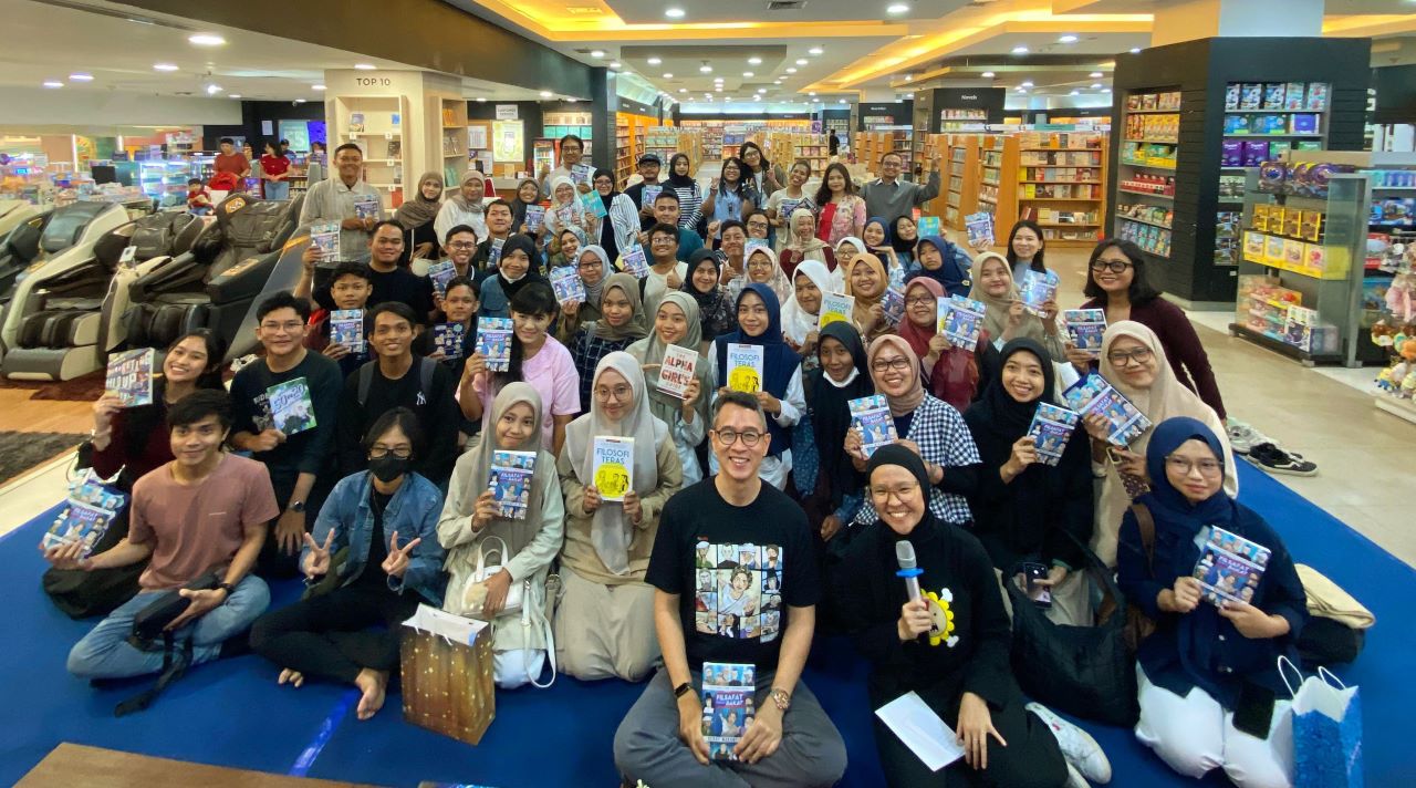 PARA PESERTA Book Tour Filsafat Punya Bakat Goes to Surabaya berfoto bersama Henry Manampiring pada Sabtu, 13 Desember 2025.--Dokumentasi Noura Books