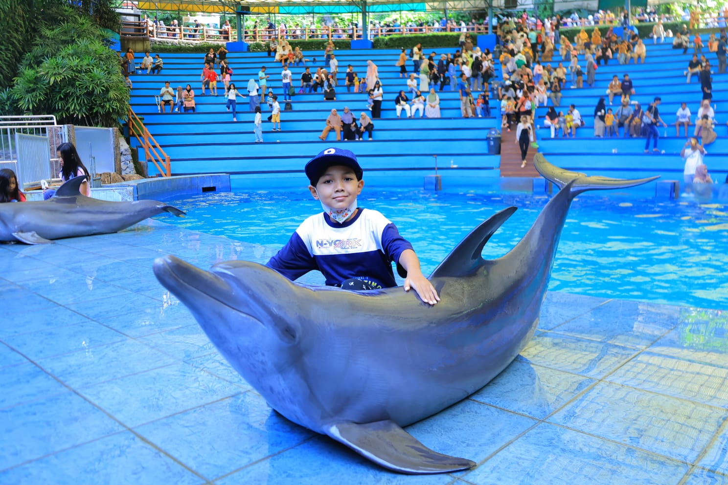 Selain dapat menyaksikan atraksi lumba-lumba, pengunjung bisa berfoto langsung dengan mamalia laut tersebut di Taman Safari Prigen.-Guruh D.N.-Harian Disway