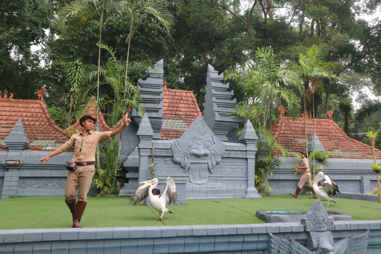 Pertunjukan burung di Taman Safari Prigen. Tampak para pelatih sedang memberi instruksi pada seekor burung.-Guruh D.N.-Harian Disway