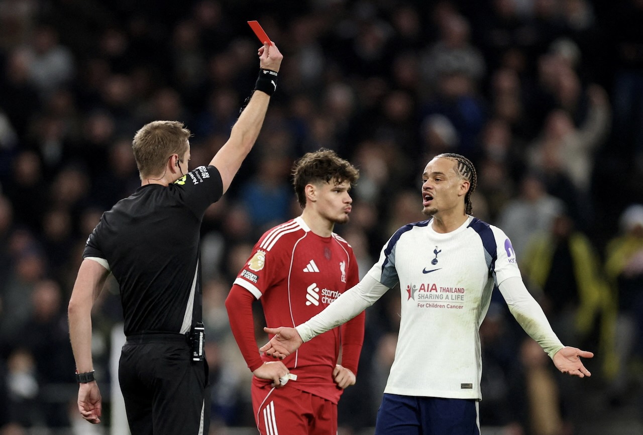 Tottenham vs Liverpool 1-2, The Reds susah payah lawan 9 pemain. Foto: Xavi Simons mendapatkan kartu merah di menit ke-33, 21 Desember 2025. -Justin Tallis-AFP