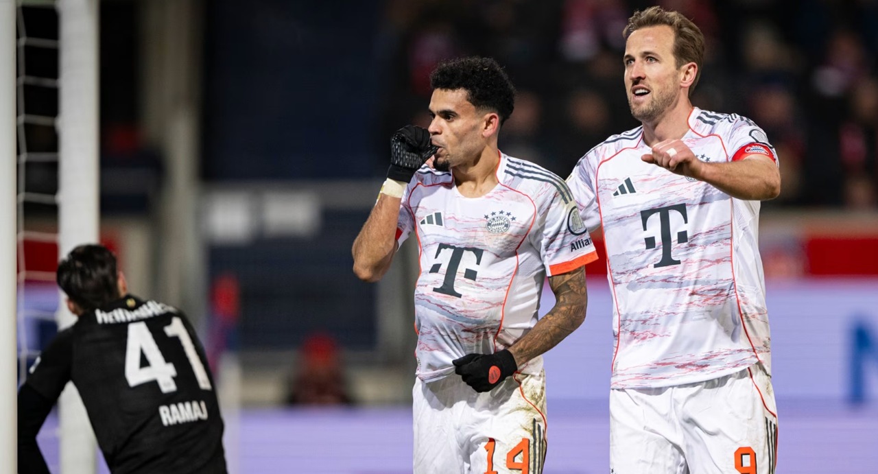 Selebrasi Luiz Diaz usai cetak gol ke gawang Heidenheim, buat skor menjadi 3-0 untuk Bayern Munchen dalam laga lanjutan Bundesliga pekan ke-15, Senin 22 Desember 2025--FCBayern.com