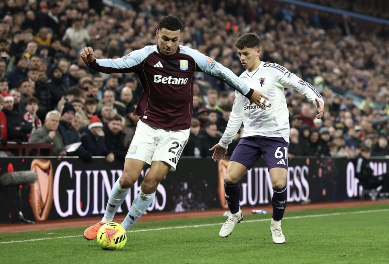 Aston Villa vs Man United 2-1, Morgan Rogers jadi mimpi buruk Setan Merah. Foto: Morgan Rogers (kiri) menggiring bola melewati bek muda Shea Lacey yang berbuah gol, 22 Desember 2025. -Ben Stansall-AFP