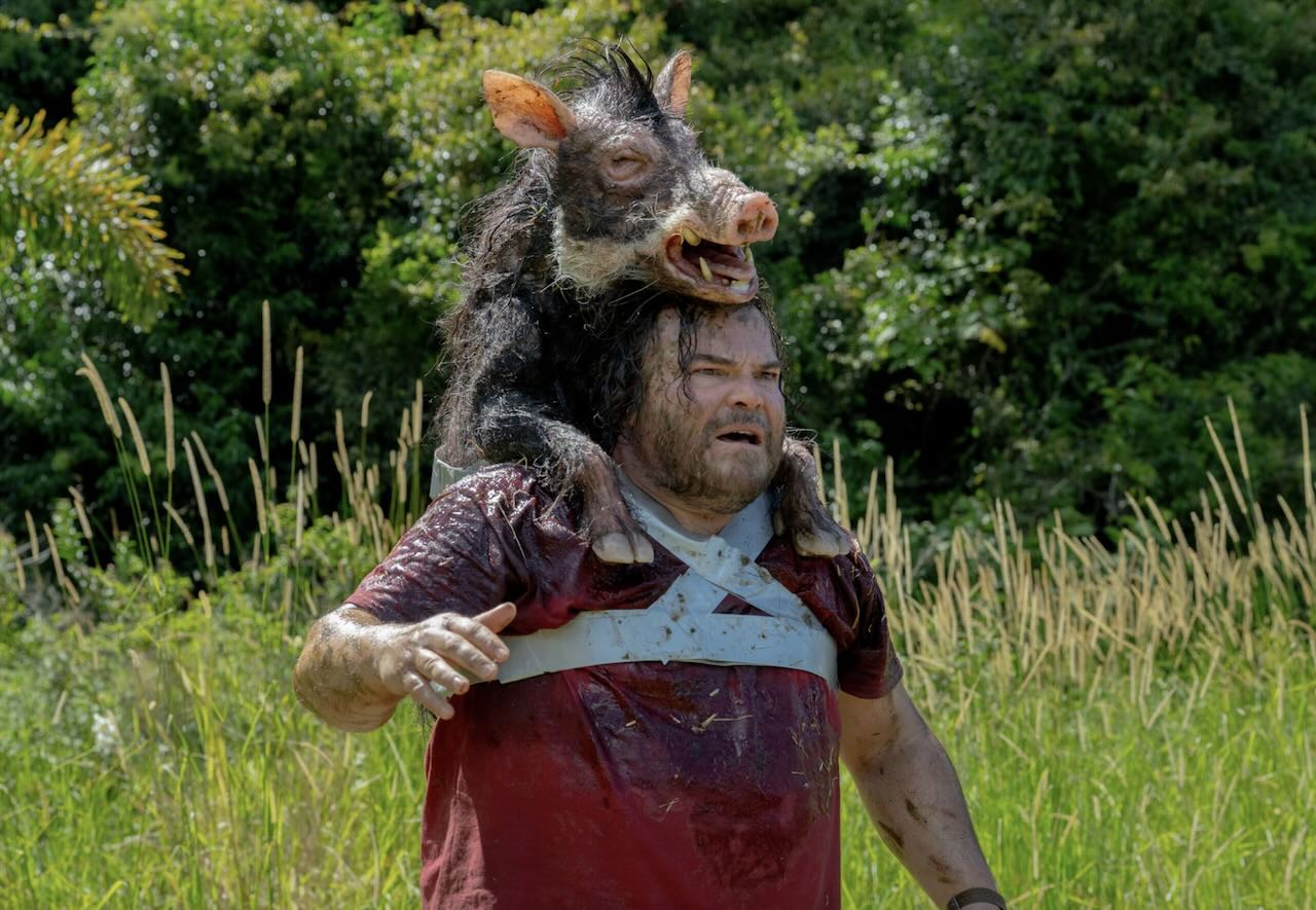 Sinopsis Anaconda 2025, aksi kocak Paul Rudd dan Jack Black hadapi teror ular raksasa. Foto: Jack Black dikejar babi hutan di hutan Amazon. -Sony Pictures-