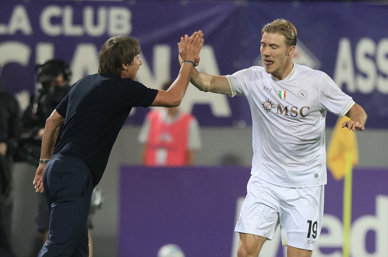 Napoli juara Piala Super Italia, Conte bilang belum dominan. Foto: Conte tos dengan Rasmus Hojlund setelah si pemain cetak gol ke gawang Fiorentina, 13 September 2025.-AFP-