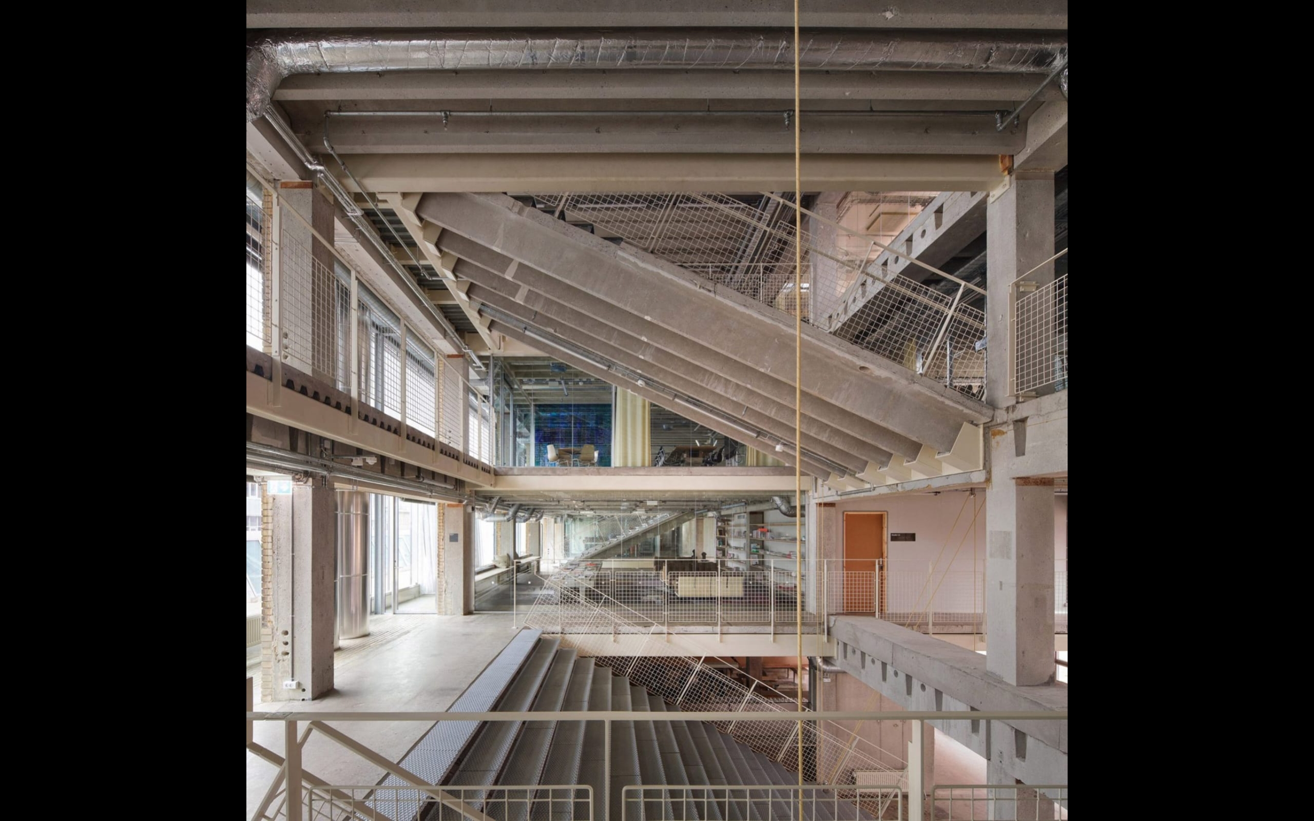 Lantai beton bekas dipotong, dibalik, dan diubah menjadi tangga yang membentuk ruang bertingkat ganda dan tiga kali tinggi. Menjadikan tangga sebagai simbol praktik arsitektur berkelanjutan.