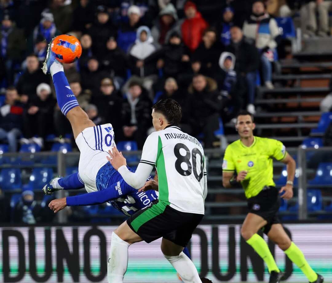 Momen gelandang Como, Nico Paz (kiri), ketika melakukan tendangan salto saat melawan Sassuolo.--Instagram @nicopaz1o