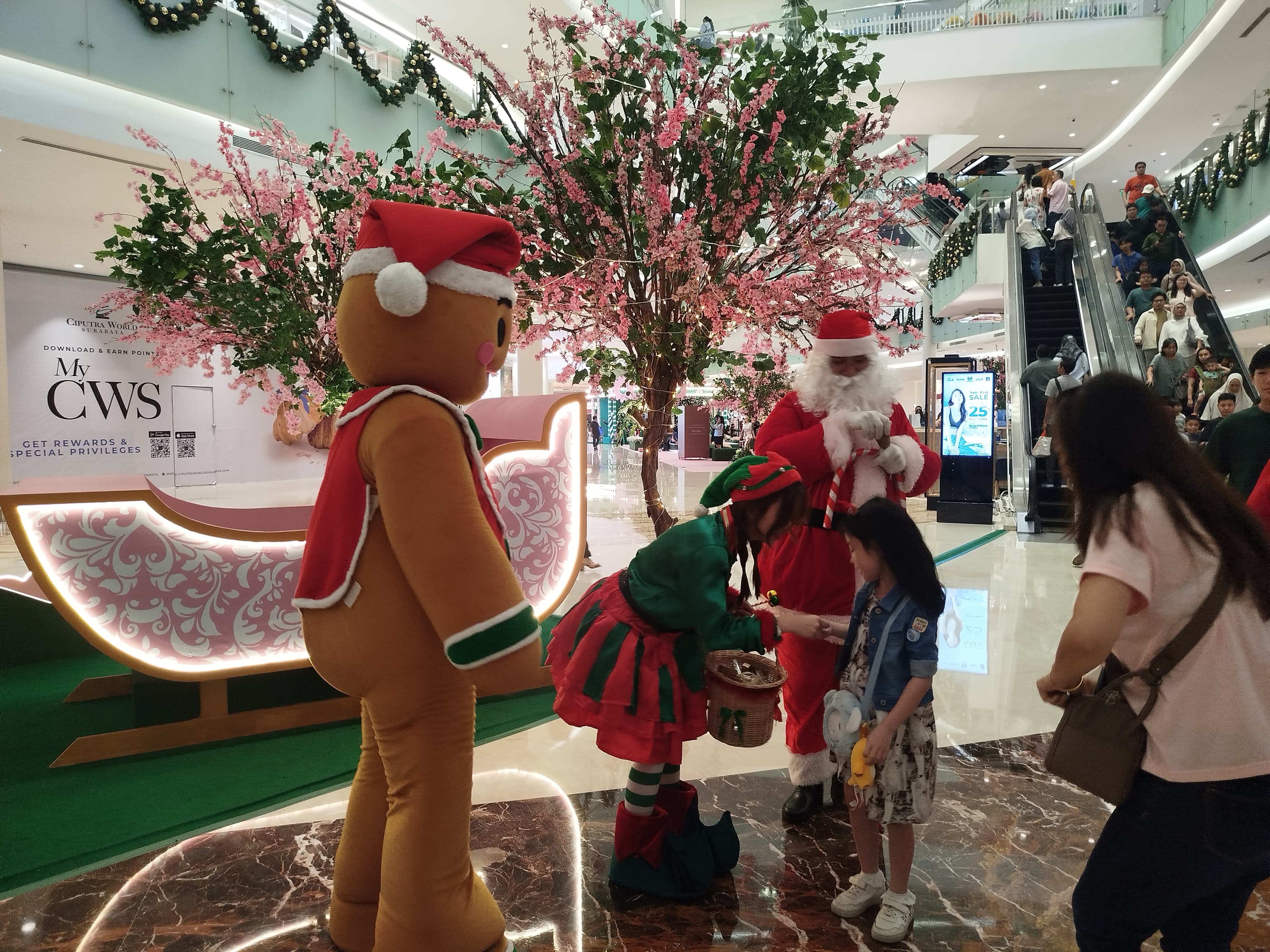 Santa Around the Mall menjadi aktivitas Natal yang paling menarik perhatian. Pengunjung anak-anak kegirangan saat bertemu Santa Claus dan Gingerbread Man. Tak hanya menyapa, pasangan ikon Natal itu juga membagikan permen.