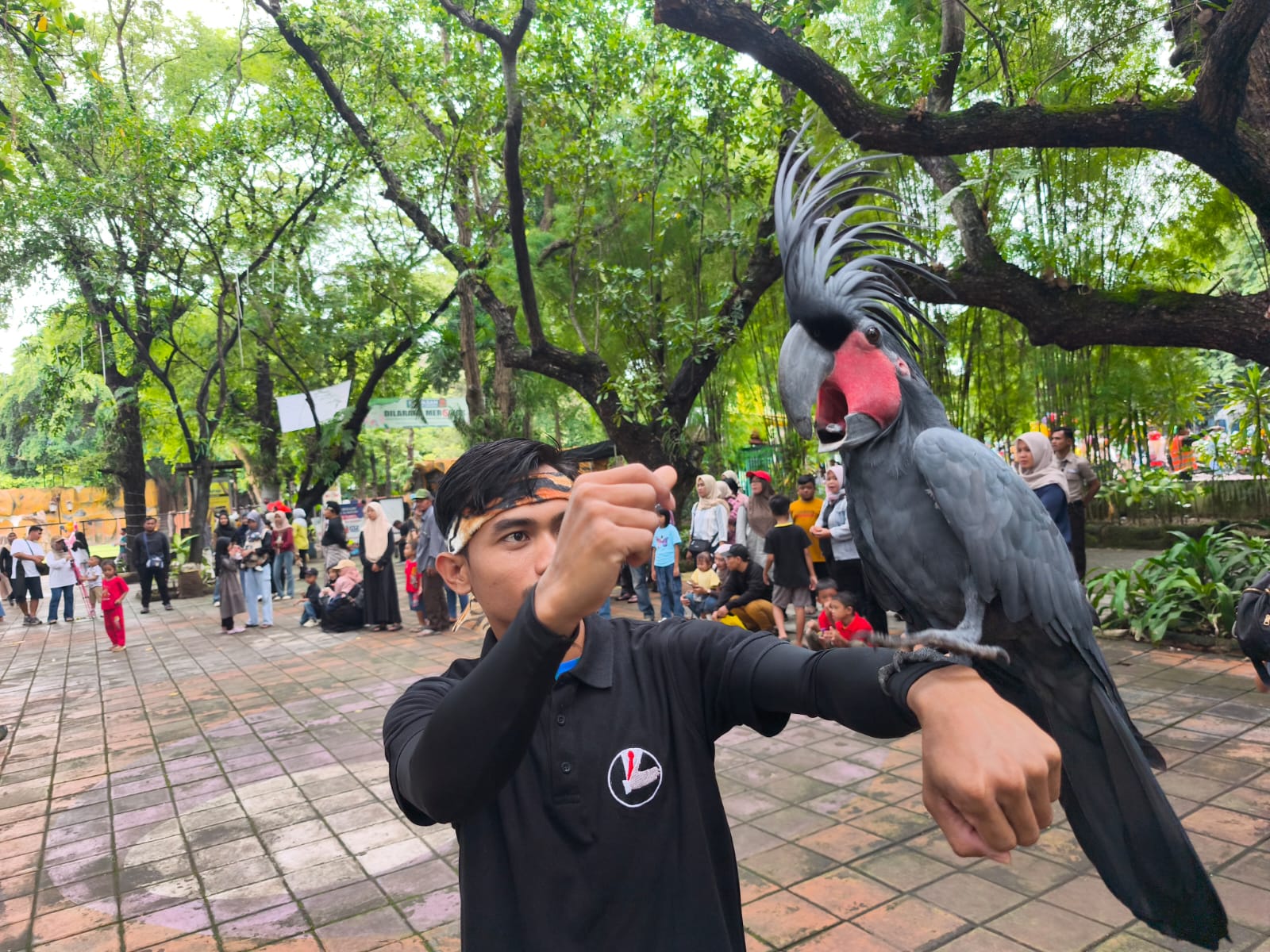 ANDIKA FEBRI memamerkan kakatua raja kepada pengunjung Kebun Binatang Surabaya pada Sabtu, 27 Desember 2025.-Boy Slamet-Harian Disway