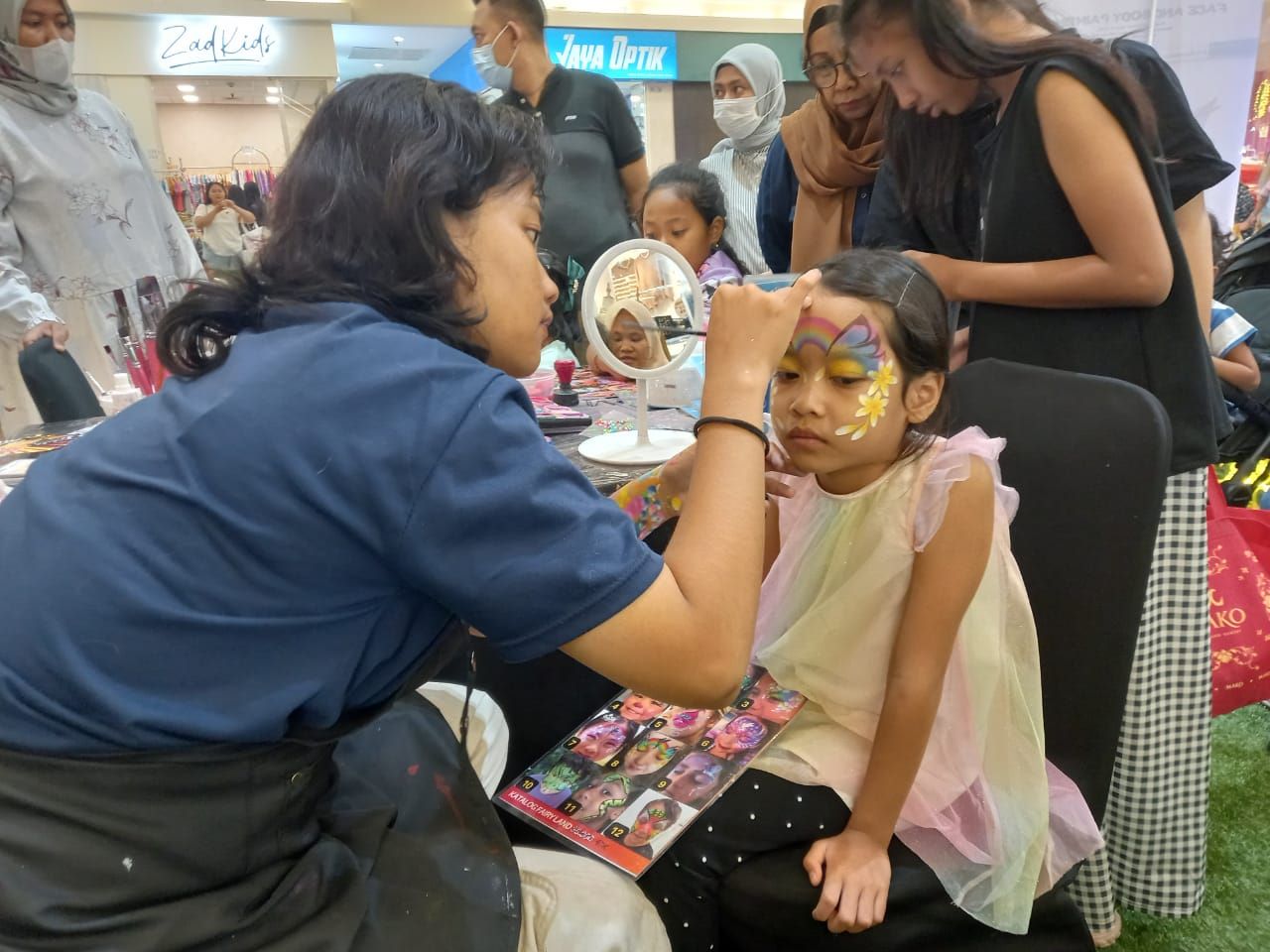 Tina yang datang bersama putrinya, Titan, mengaku puas melihat hasil lukisan Ayesha di wajah buah hatinya yang berusia 7 tahun. “Ini sesuai banget dengan permintaaan anak saya,” ucapnya.