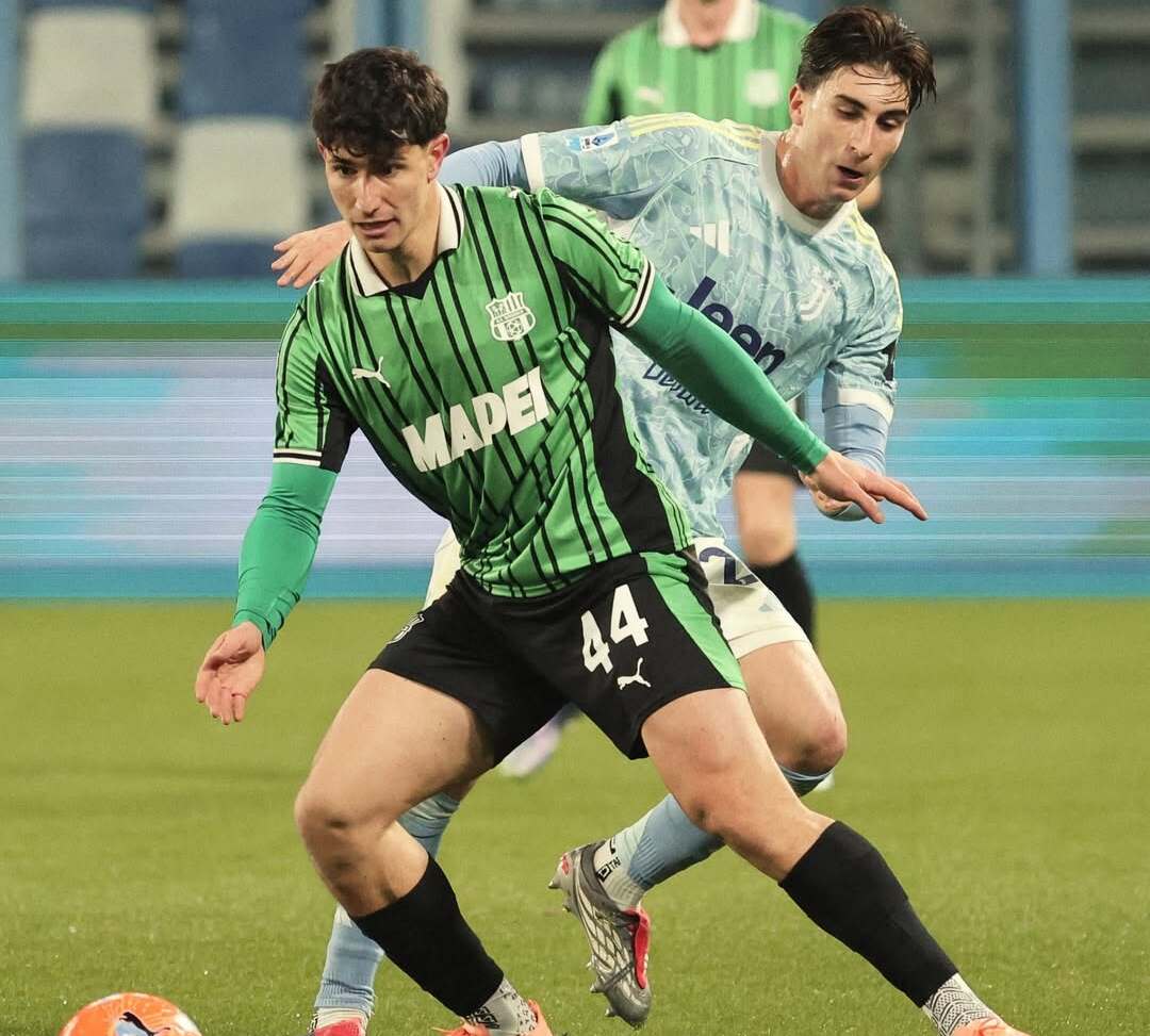 Momen penyerang Sassuolo, Eduardo Iannoni (kiri), ketika mencoba melewati kawalan gelandang Juventus, Fabio Miretti (kanan). Rabu, 7 Januari 2026.--Instagram @sassuolocalcio