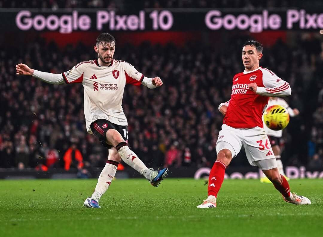 Momen bek kanan Liverpool, Conor Bradley (kiri), ketika melakukan tembakan di area kiri pertahanan Arsenal. Jumat, 9 Januari 2026.--Instagram @liverpoolfc