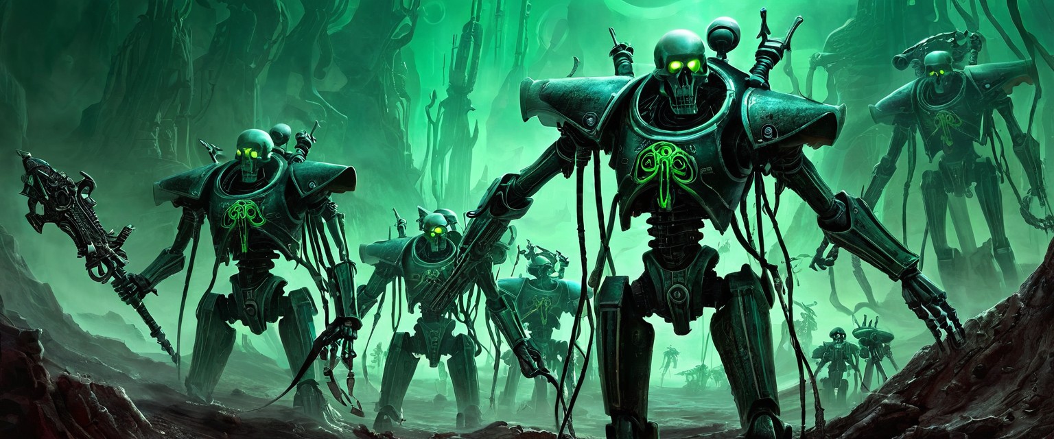 Bangsa Necrons adalah sekumpulan robot bernyawa yang siap menghancurkan beragam planet di Warhammer 40K. --stablediffused