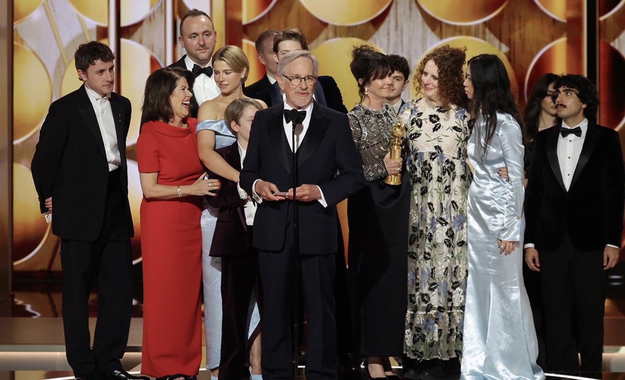 Daftar pemenang Golden Globes 2026, One Battle For Another borong 4 trofi. Foto: Produser Hamnet, Steven Spielberg, berpidato saat menerima trofi Film Terbaik - Drama di Beverly Hilton, Los Angeles, 12 Januari 2026. -Amy Sussman-Getty Images via AFP