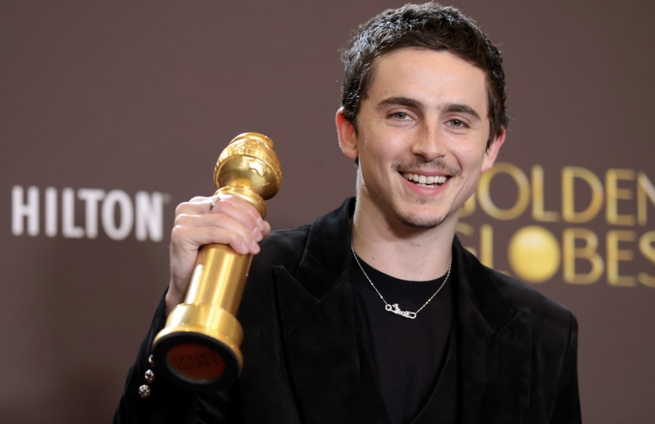 Daftar pemenang Golden Globes 2026, One Battle For Another borong 4 trofi. Foto: Timotee Chalamet menunjukkan trofi Aktor Terbaik - Musikal/Komedi di Beverly Hilton, Los Angeles, 12 Januari 2026. -Amy Sussman-AFP