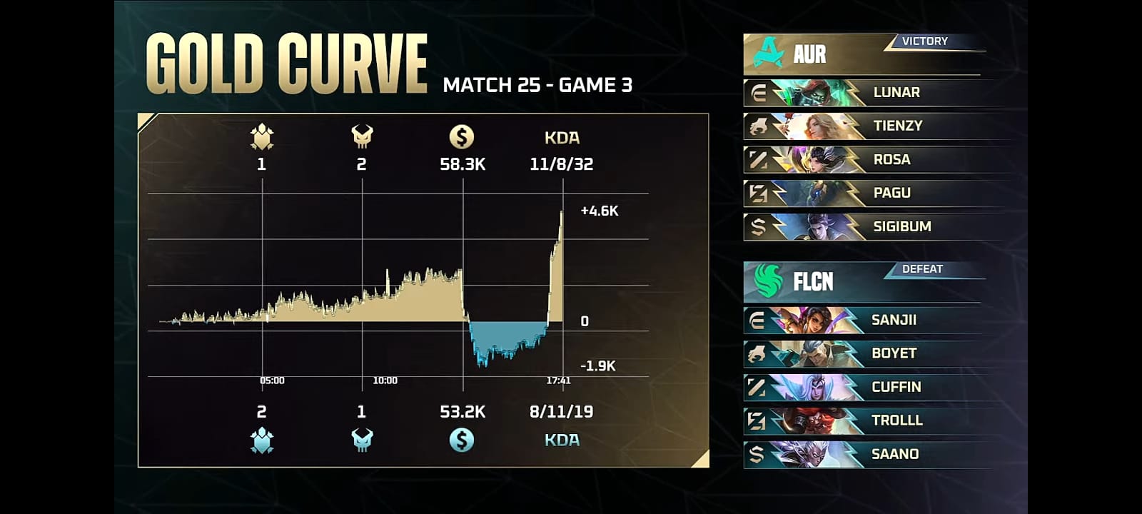 Aurora mampu memaksimalkan keunggulan objektif dan rotasi peta, memaksa Falcons untuk bereaksi defensif. Kombinasi laning agresif dan hypercarry dari hero-hero yang sulit lock membuat mereka unggul signifikan.