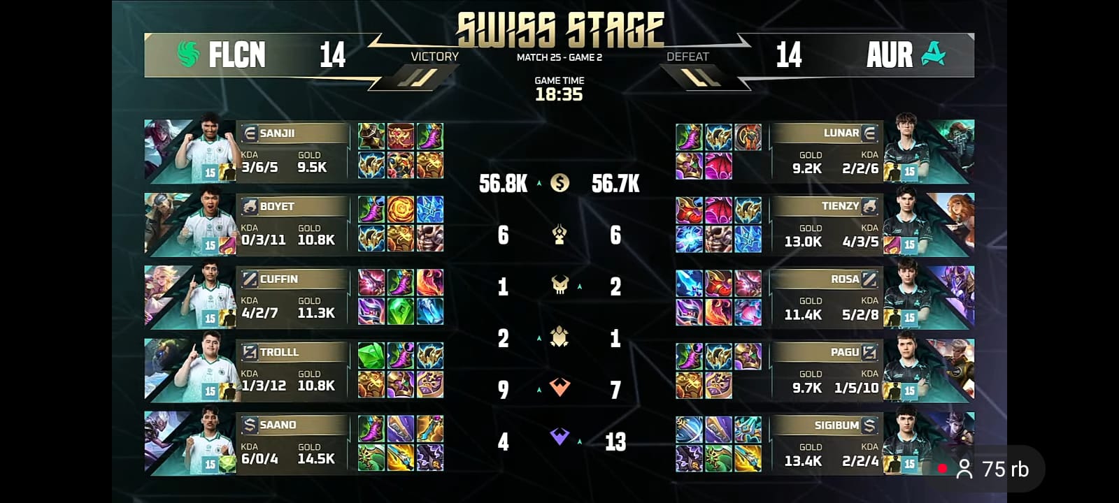 Ketika clash pecah di sekitar Lord ketiga, meski Aurora sempat unggul jumlah pemain, Falcons memanfaatkan kekosongan ruang dan item finishing yang matang untuk akhirnya mengunci Game 2 di menit akhir.