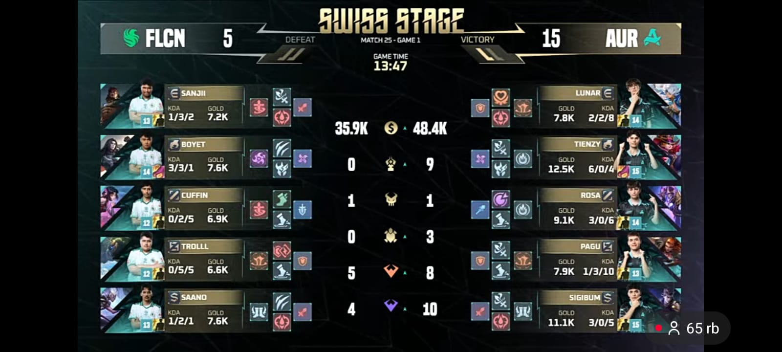 Aurora mampu menumbangkan tiga anggota Falcons dan langsung mengambil Lord, lalu memanfaatkan buff tersebut untuk menutup pertandingan di menit 18:41. Kemenangan ini sekaligus memastikan Aurora melaju ke Knockout Stage, bergabung bersama wakil Indonesia seperti Alter Ego dan SRG.