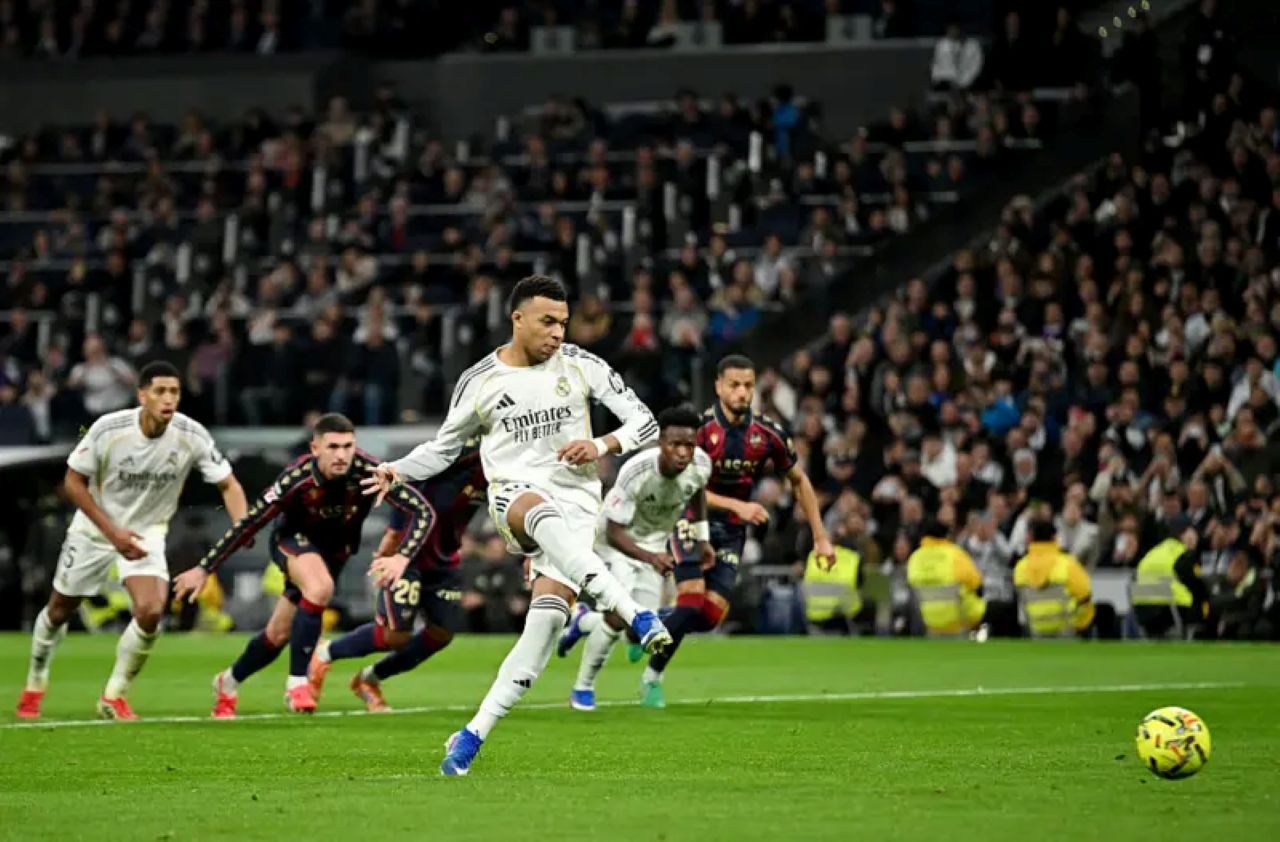 Gol penalti Kylian Mbappe buka keunggulan Real Madrid lawan Levante dalam laga La Liga 2025/2026 pekan ke-20, Sabtu 17 Januari 2026--Getty Images