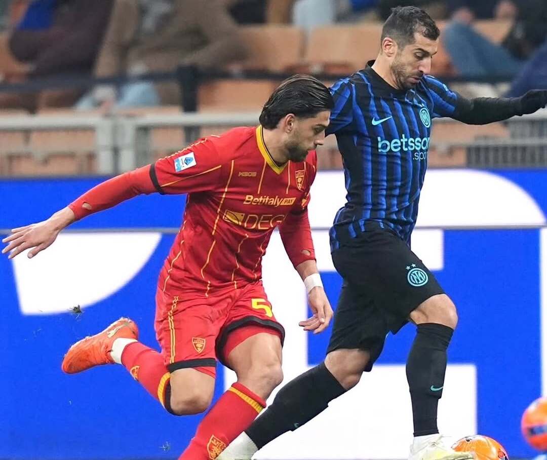 Momen gelandang Inter Milan, Henrikh Mkhitaryan (kanan), ketika berebut bola dengan penyerang US Lecce, Santiago Pierotti (kiri). Kamis, 15 Januari 2026.--Instagram