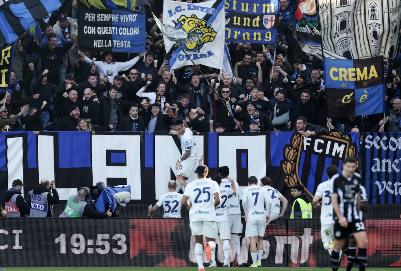 Udinese vs Inter Milan 0-1, gol Lautaro Martinez buat Nerazzurri nyaman di pucuk. Foto: Para pemain Inter merayakan gol Lautaro dengan para penggemar di Friuli, 17 Januari 2026.-Timothy Rogers-Getty Images via AFP