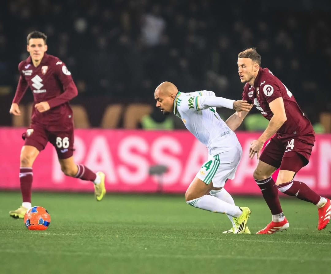 Momen penyerang baru AS Roma, Donyell Malen (tengah), ketika berebut bola dengan bek Torino, Ardian Ismajli (kanan). Senin, 19 Januari 2026.--Instagram @laromadaily