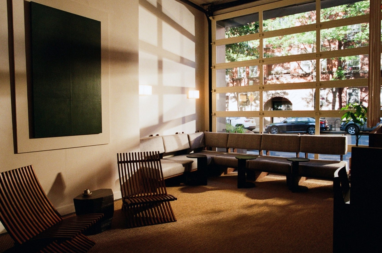 Ruang santai dalam Sauna Akari Greenpoint memiliki tempat duduk berupa bangku empuk yang terletak di bawah jendela bergaya garasi.-Crooked Letter-dezeen.com