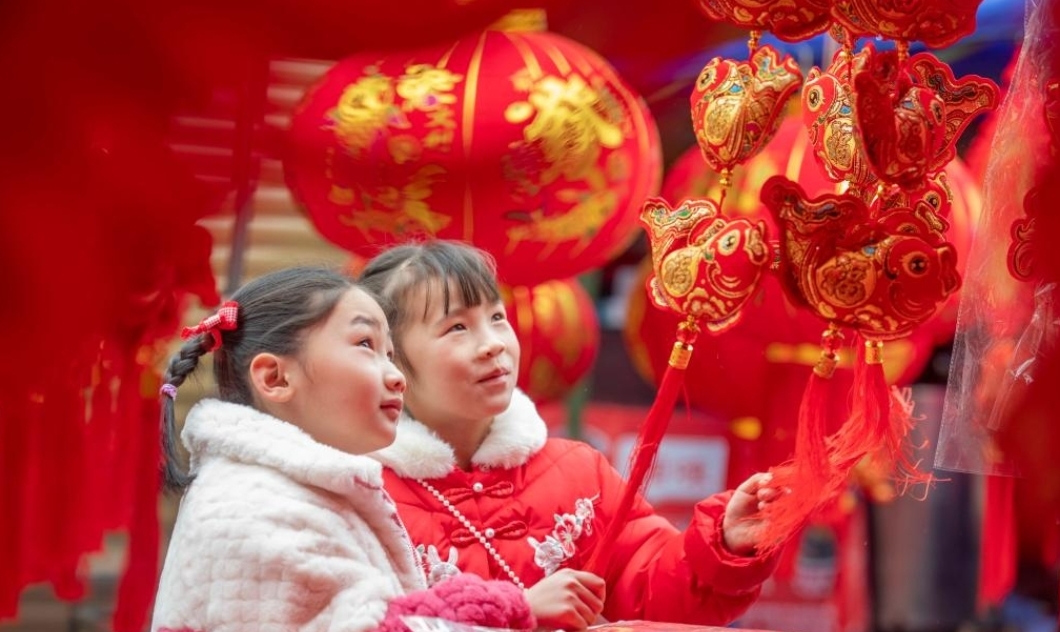 Dua orang anak di Tiongkok yang tampak antusias mengamati pernak-pernik Imlek.-China Daily-