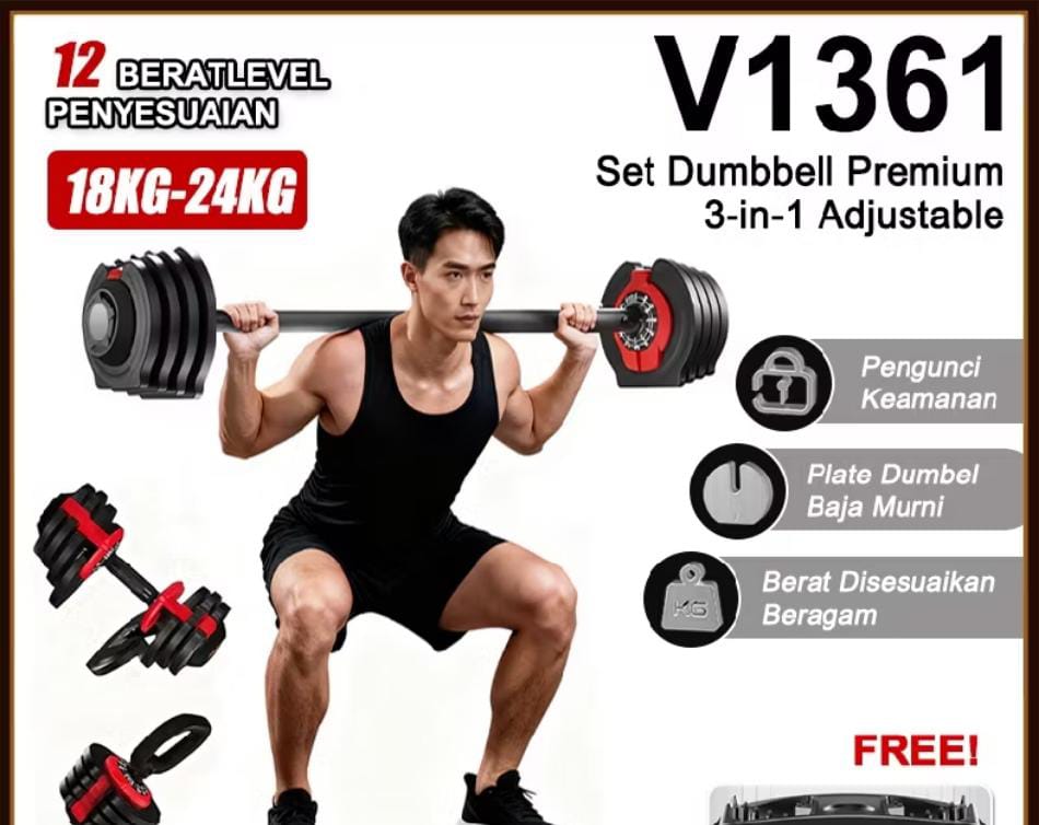 Adjustable dumbbell dengan 15 level bobot (18–24 kg) ini fleksibel digunakan. Bentuknya bisa disesuaikan, materialnya kuat dan awet, hemat ruang, dan cocok untuk pemula maupun pencinta fitness berpengalaman.