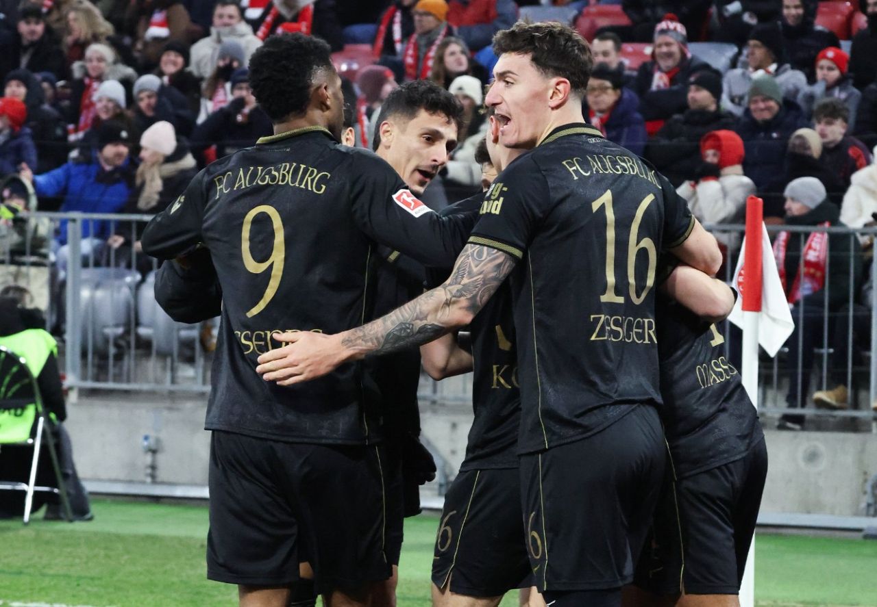 Para pemain Augsburg berselebrasi usai Arthur Chaves samakan kedudukan lawan Bayern dan membuat skor menjadi 1-1 pada laga Bundesliga 2025/2026 matchday ke-19, Sabtu 24 Januari 2026--@FCAugsburg-X