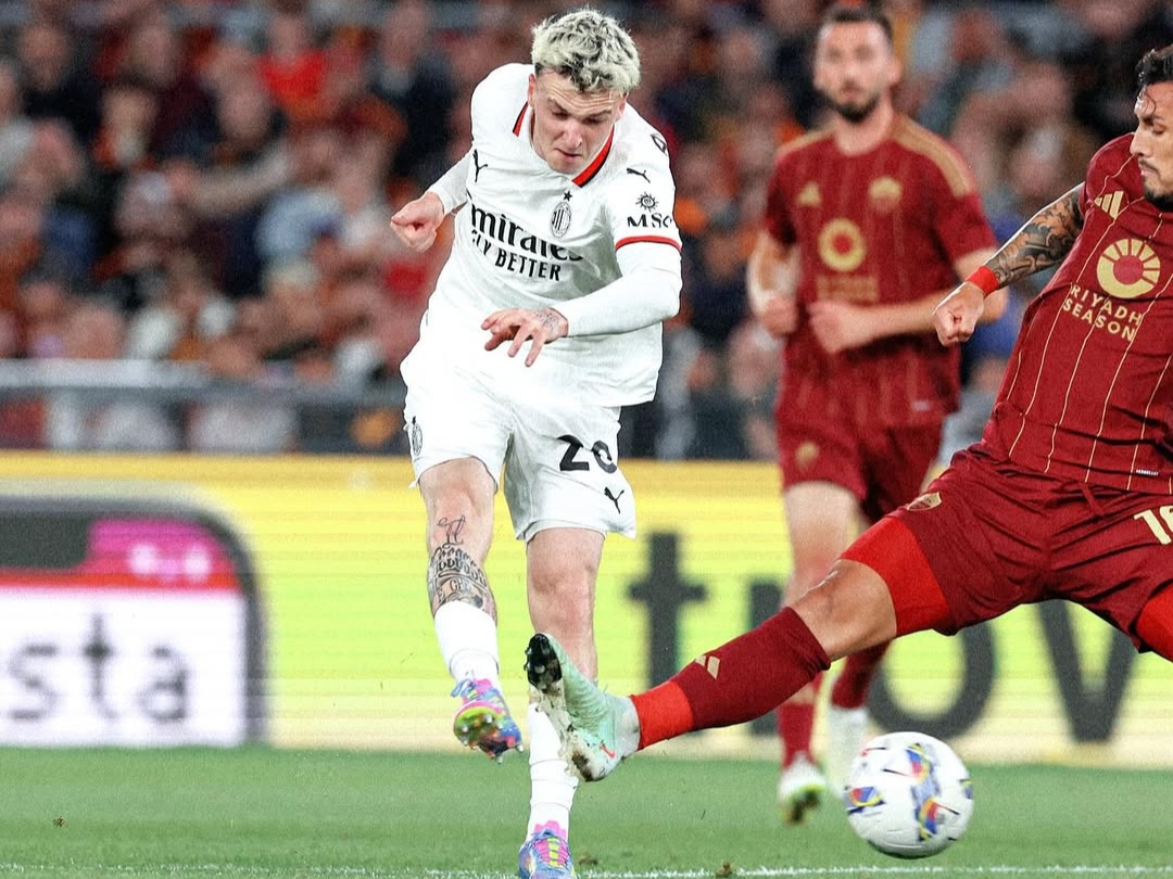 Alex Jimenez (kiri) dan Leandro Paredes (kanan) berduel di lapangan saat pertandingan Liga Italia antara Roma vs Milan, 19 Mei 2025-Instagram-@acmilan