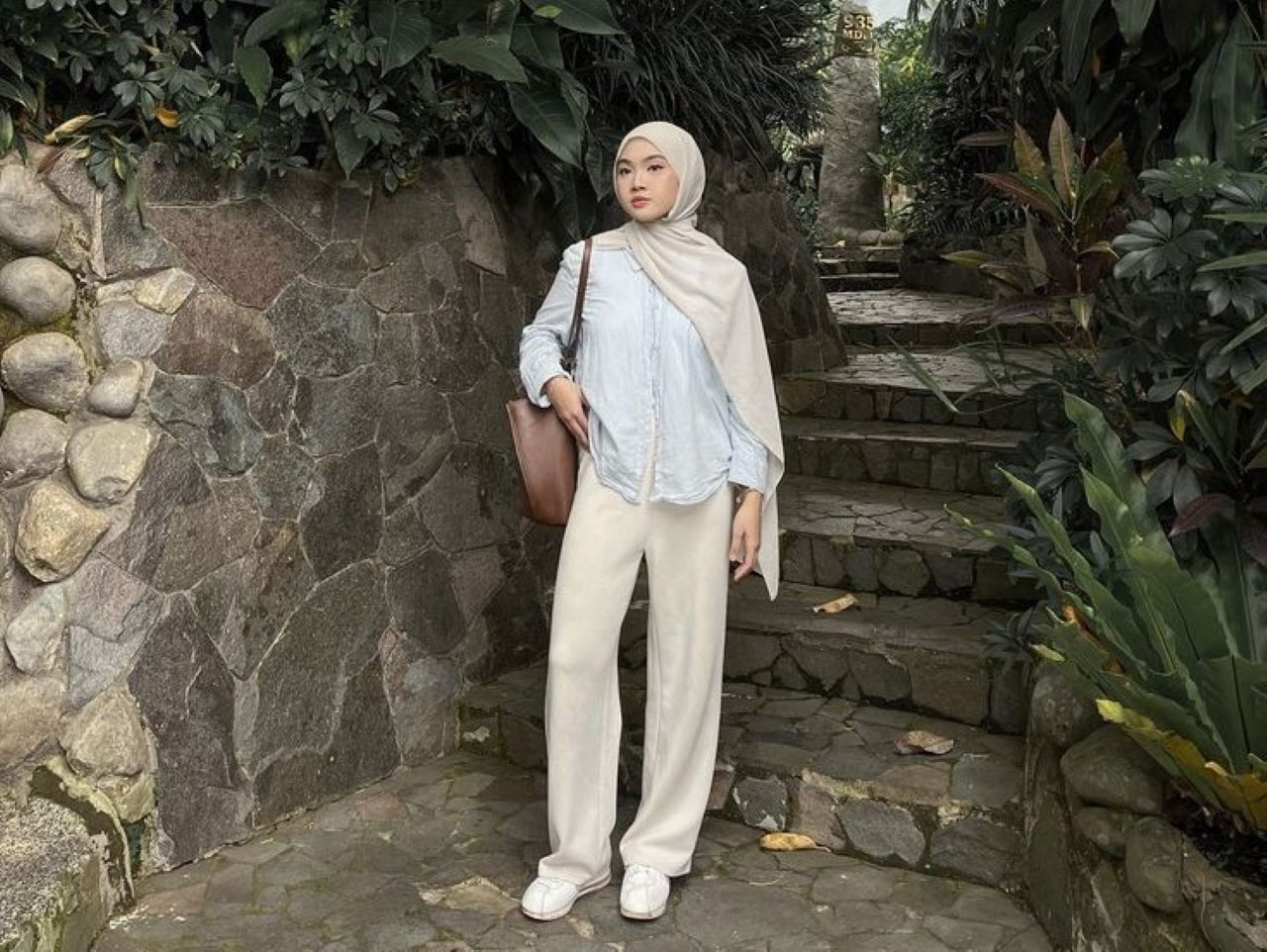 Inspirasi OOTD Kantor Wanita 2026 menampilkan gaya kerja rapi dan modern dengan blouse putih, celana krem, serta hijab netral yang nyaman digunakan sehari-hari.-husna-pinterest