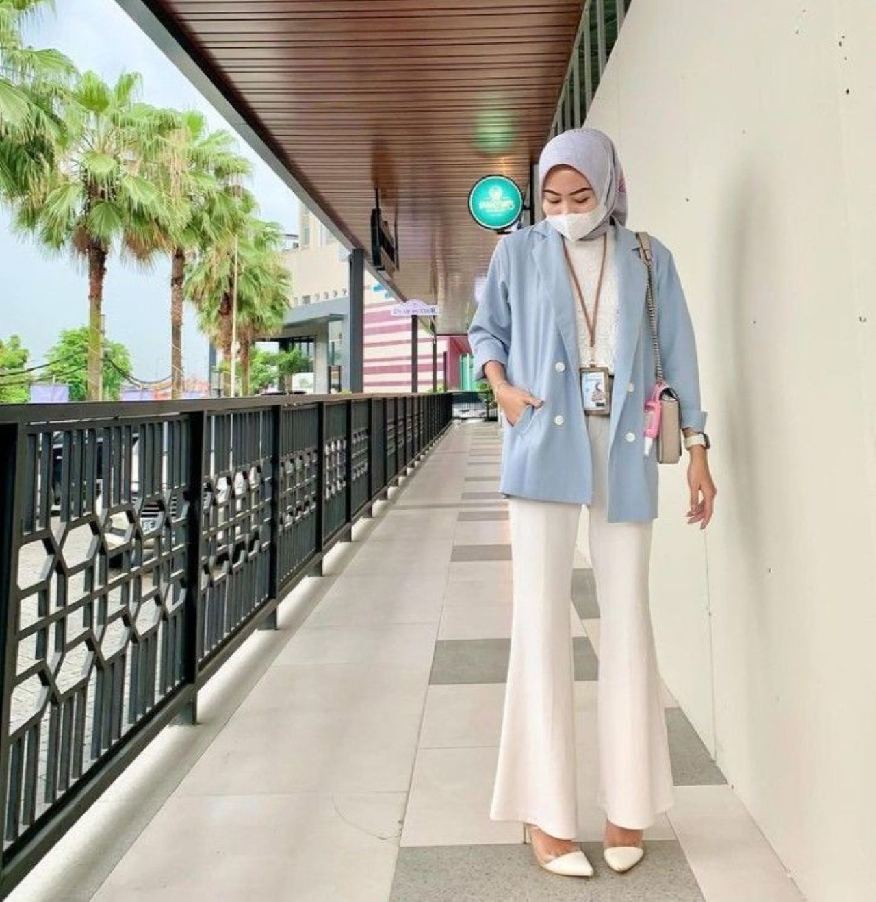 OOTD kantor adaptif menampilkan blazer biru, celana putih, dan hijab netral sebagai gaya kerja modern yang rapi, nyaman, dan fleksibel.-yola-pinterest