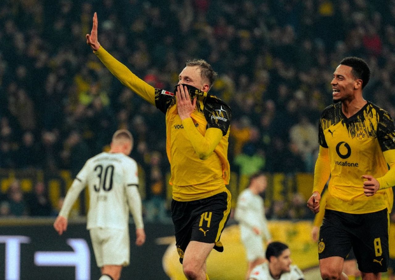 Selebrasi Maximilian Beier usai gandakan keunggulan bagi Dortmund atas Monchengladbach di injury time babak kedua, laga lanjutan pekan ke-15 Bundesliga 2025/2026, Sabtu 20 Desember 2025--@BlackYellow-X