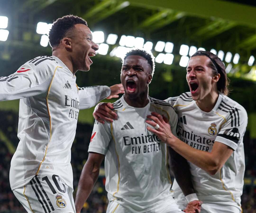 Para pemain Real Madrid merayakan gol penentu kemenangan atas Villarreal yang dicetak oleh Kylian Mbappe (kiri). Minggu, 25 Januari 2026.--Instagram @realmadrid