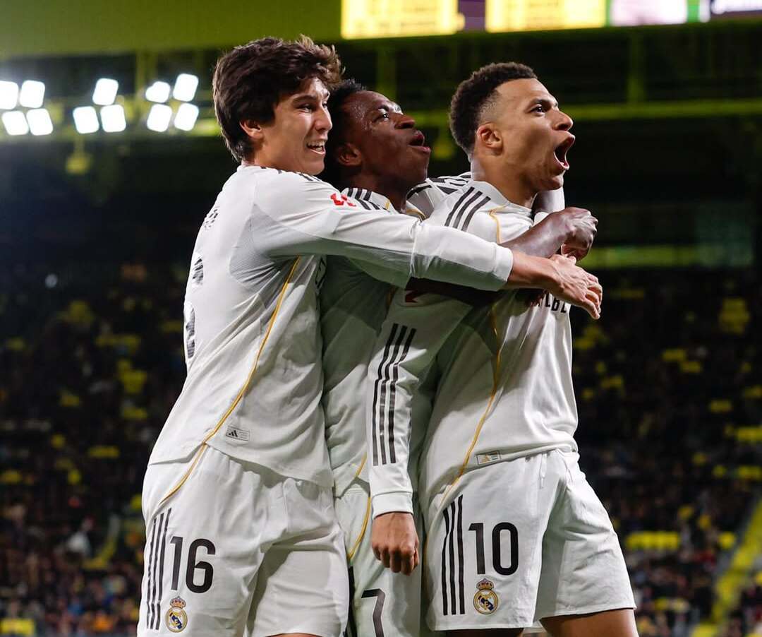 Para pemain Real Madrid merayakan gol penentu kemenangan atas Villarreal yang dicetak oleh Kylian Mbappe (kanan). Minggu, 25 Januari 2026.--Instagram @realmadrid