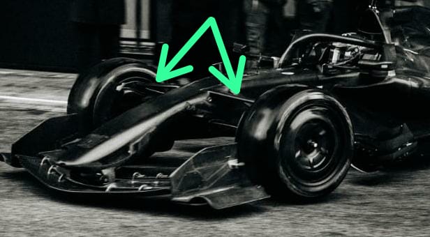 Tanda panah warna hijau, menunjukkan penggunaan sistem suspensi Double Pushrod di Mobil Aston Martin AMR26, yang diuji pada sesi tes pramusim di Barcelona 2026--Twitter Aston Martin Aramco F1 Team @AstonMartinF1