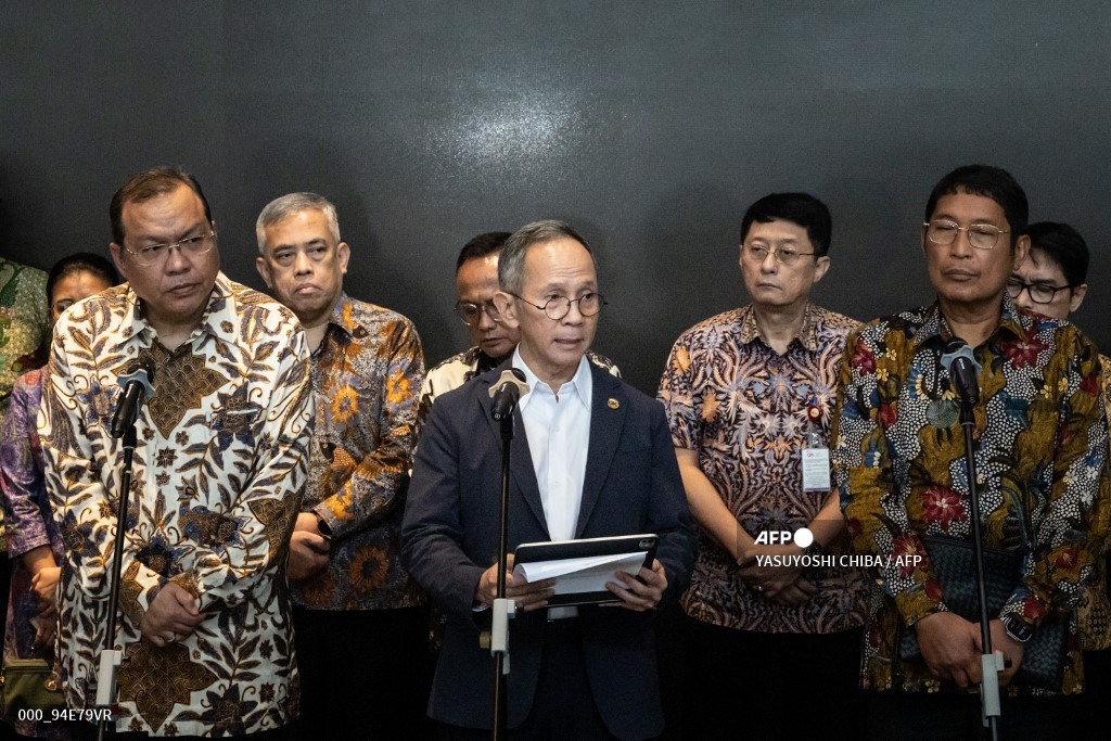 MAHENDRA SIREGAR (tengah), Ketua Dewan Komisioner Otoritas Jasa Keuangan, berbicara kepada wartawan di gedung Bursa Efek Indonesia, 29 Januari 2026.-Yasuyoshi Chiba-AFP-