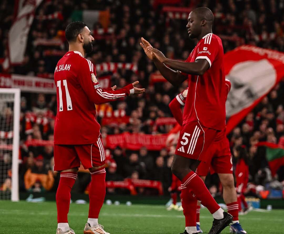Potret penyerang Liverpool, Mohamed Salah (kiri), ketika melakukan tos dengan Ibrahima Konate (kanan) dalam laga kontra Newcastle United. Minggu, 1 Februari 2026.--Instagram @liverpoolfc