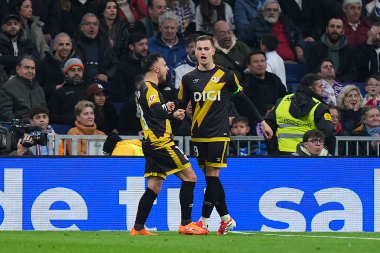 Selebrasi Jorge de Frutos usai samakan kedudukan bagi Rayo Vallecano lawan Real Madrid dalam laga La Liga 2025/2026 jornada ke-22, Minggu 1 Februari 2026-Angel Martinez-Getty Images