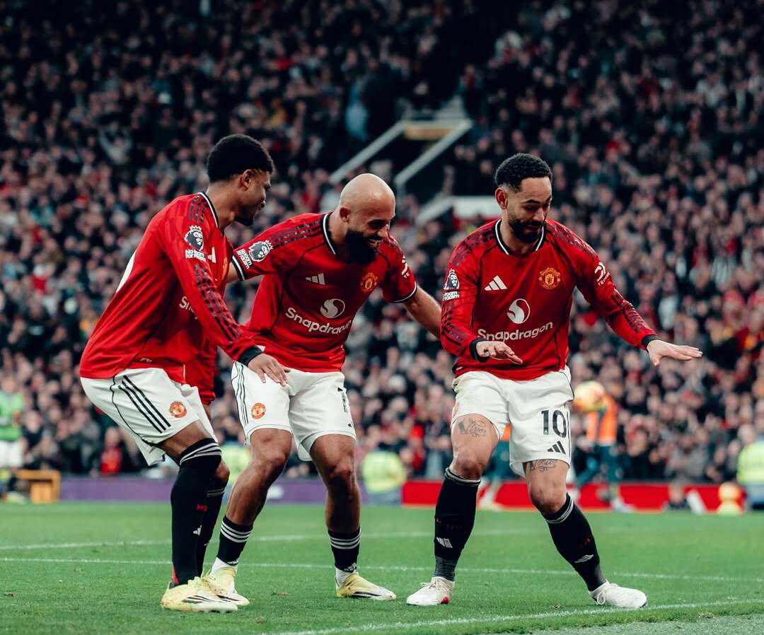 Momen penyerang Manchester United, Amad Diallo (kiri) dan Bryan Mbeumo (tengah), ketika meniru selebrasi Matheus Cunha (kanan) usai mencetak gol pada laga kontra Fulham. Minggu, 1 Februari 2026.--Instagram @premierleague
