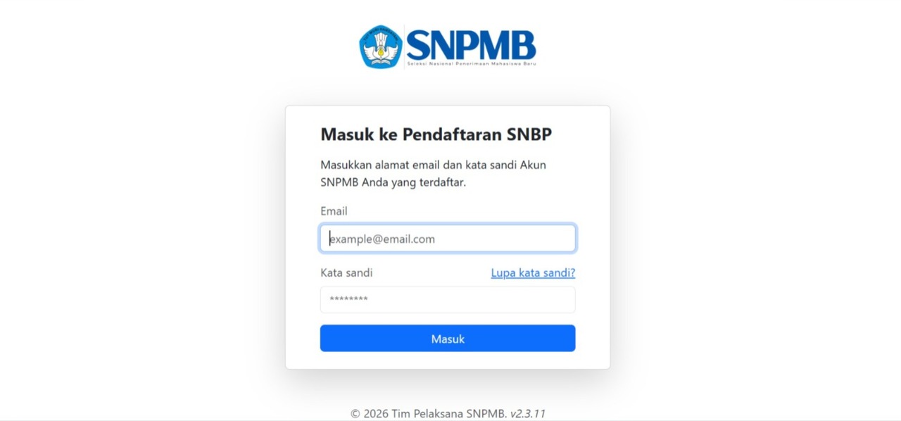 Pendaftaran dapat dilakukan melalui portal SNPMB pada tautan https://portal.snpmb.id/ atau melalui https://snbp.snpmb.id/.