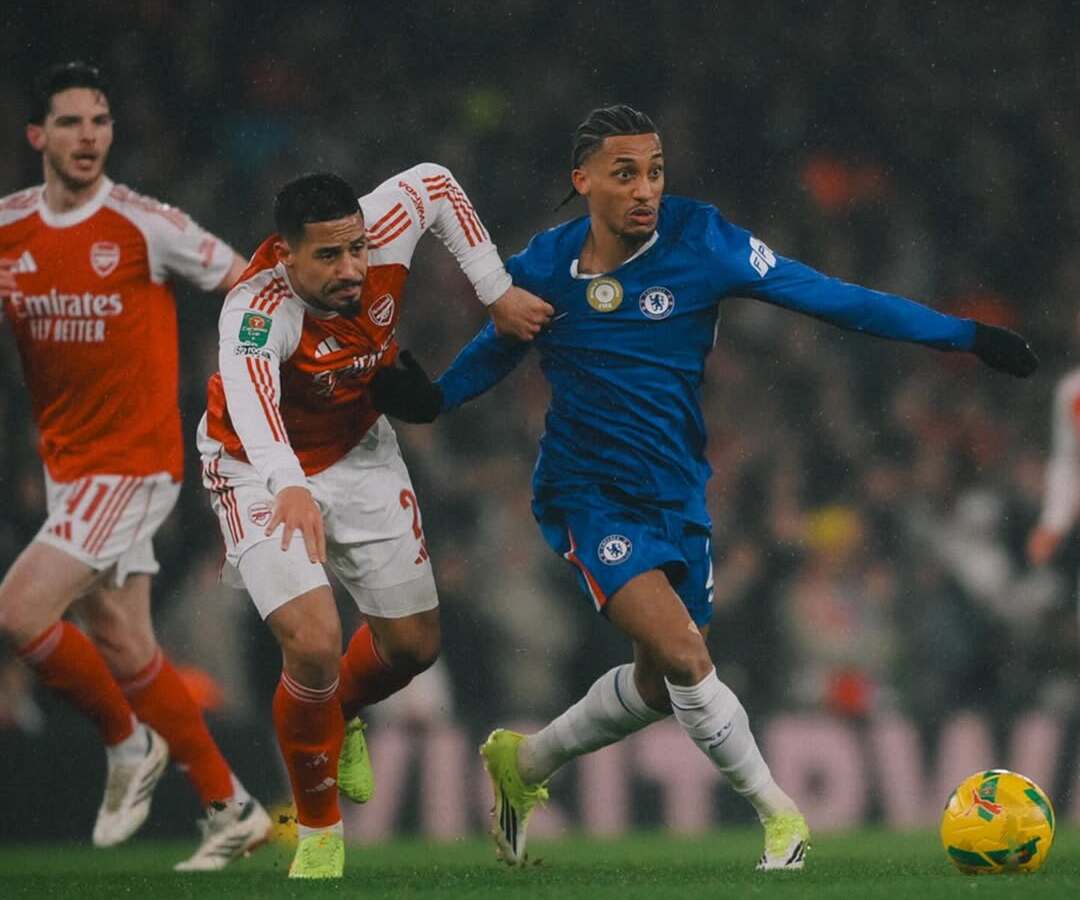 Aksi penyerang Chelsea, Joao Pedro (kanan), ketika berusaha melewati kawalan bek Arsenal, William Saliba (kiri). Rabu, 4 Februari 2026.--Instagram @chelseafc