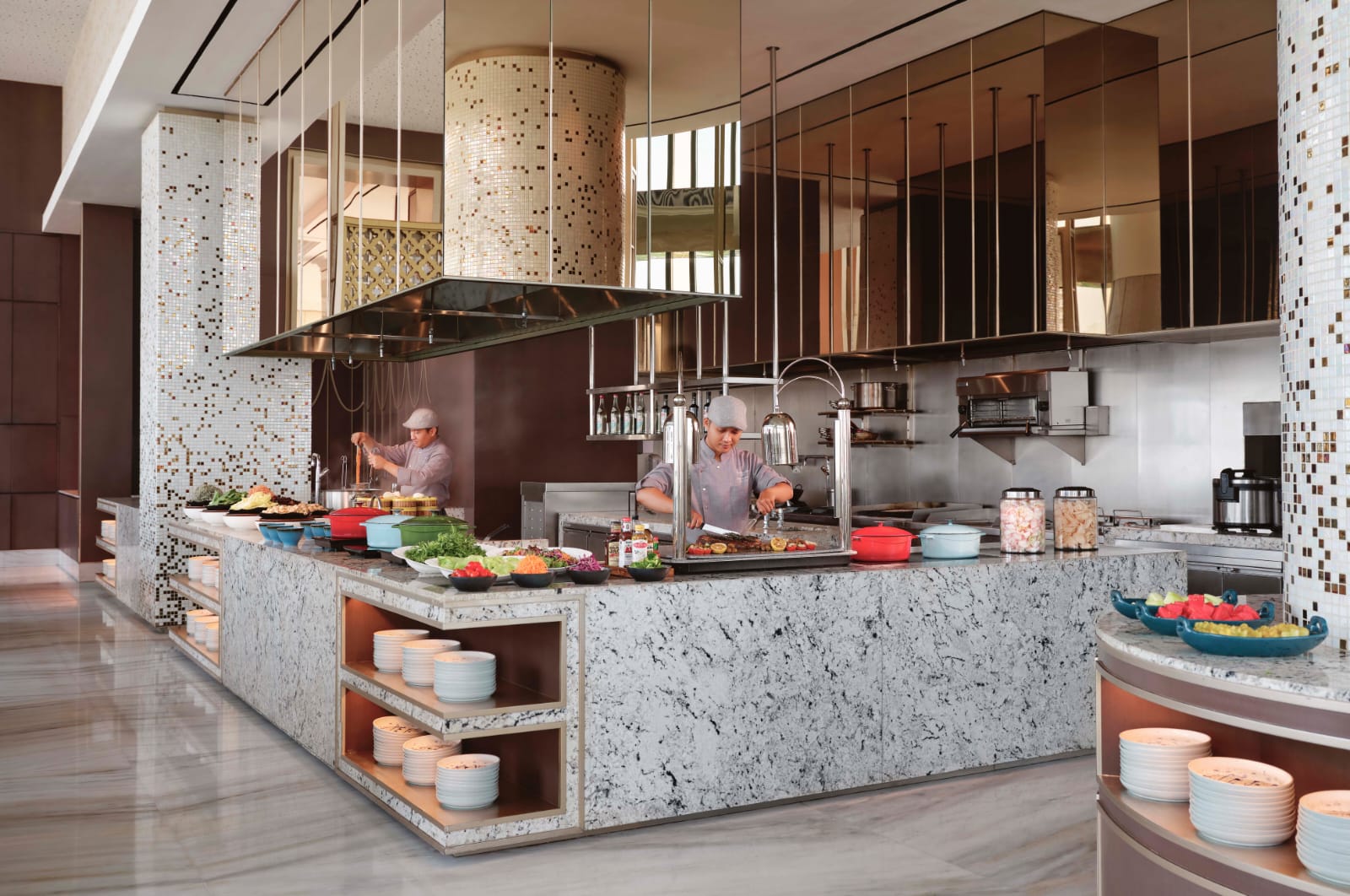 Slow baked lamb ouzi dengan basmati rice bertabur rempah, nasi kebuli, oriental steamed dimsum, arash à la Minute Steak, hingga hidangan penutup disiapkan oleh Westin Surabaya dan Four Points. -The Westin Surabaya-