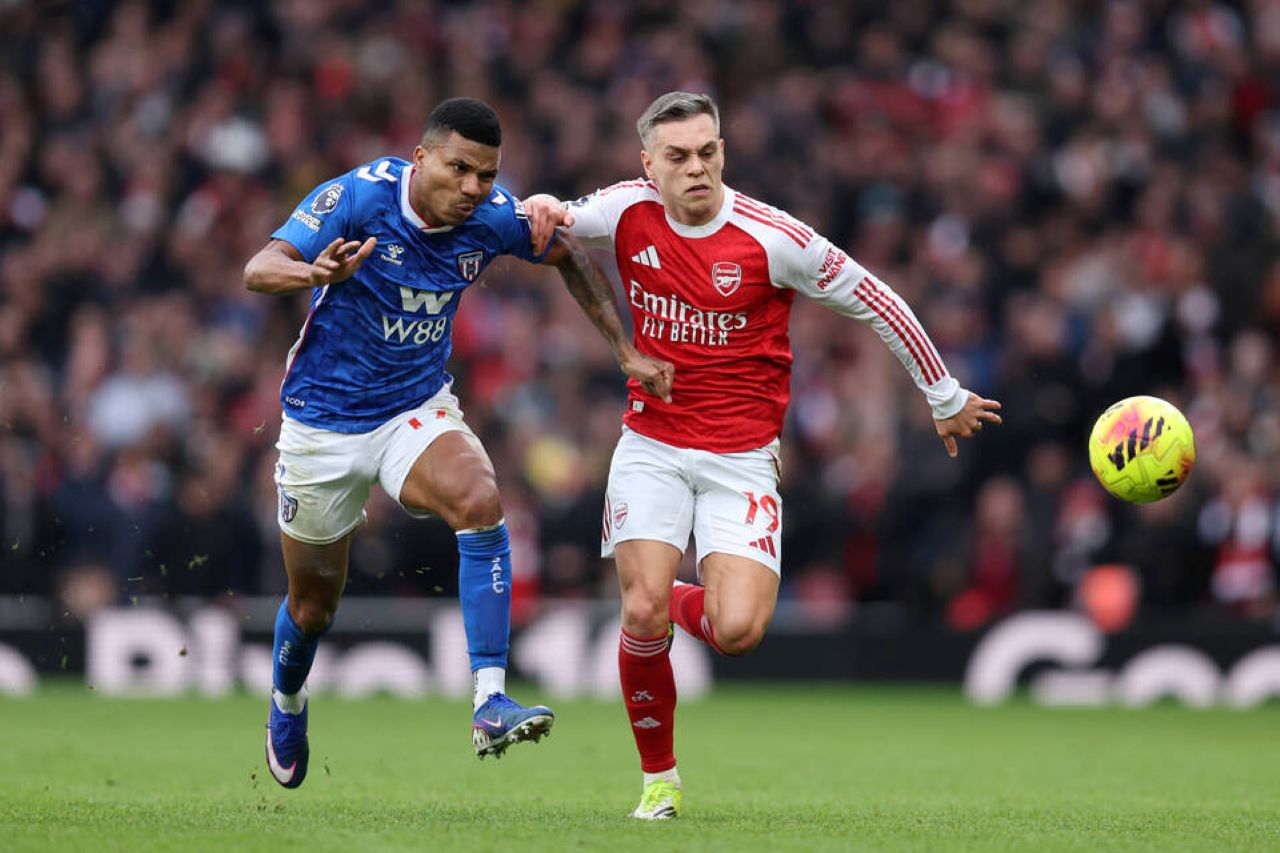 Duel Reinildo (kiri) dan Leandro Trossard (kanan) dalam laga Arsenal vs Sunderland, lanjutan Premier League 2025/2026 matchday ke-25, Minggu 8 Februari 2026--IMAGO