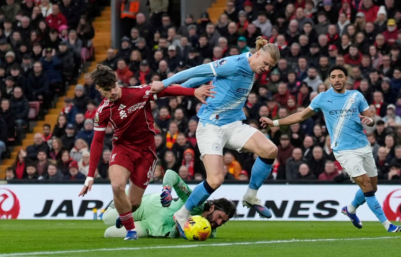 Duel Milos Kerkez (kiri), Allison (bawah) dan Erling Haaland (kanan) dalam laga Liverpool vs Man City, lanjutan Premier League 2025/2026 matchday ke-25, Senin 9 Februari 2026-Peter Byrne-PA