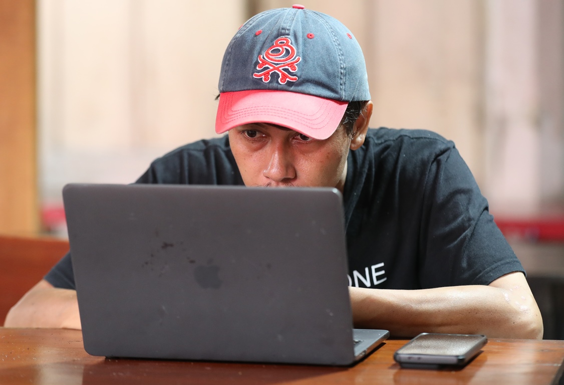Sudarmono menyimak dengan serius siaran Podcast melalui laptop.-Boy Slamet-