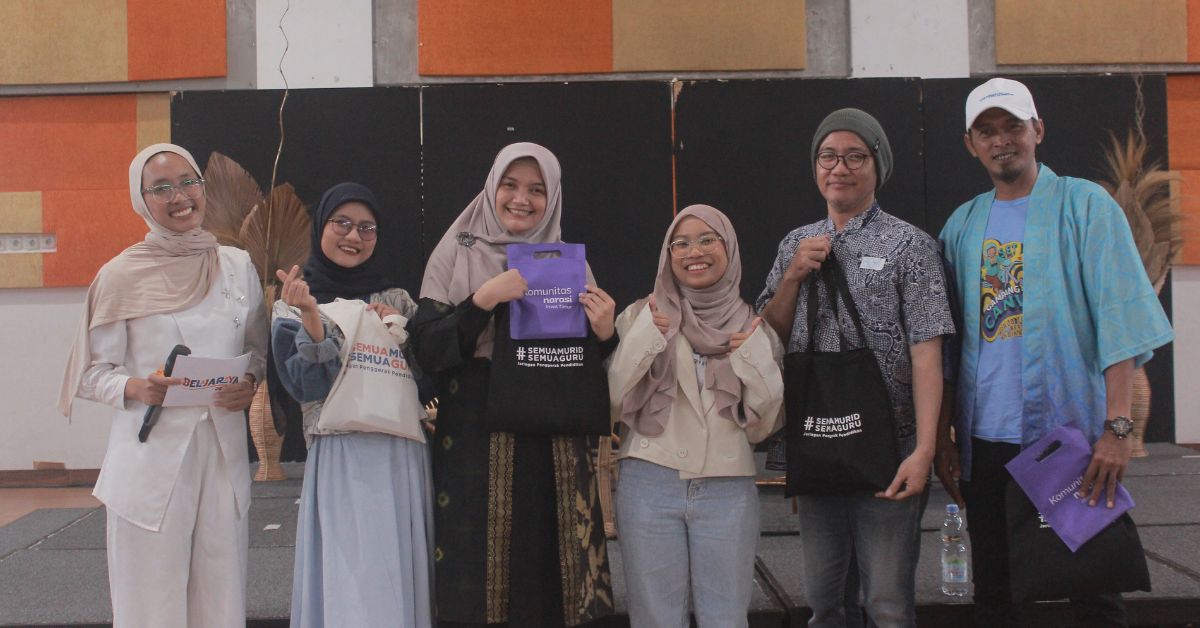 PERWAKILAN komunitas yang hadir dalam Belajaraya 2026 berfoto bersama Adhicipta R. Wirawan di Sekolah Cikal Surabaya. - Rosyidah Ariyati - Harian Disway