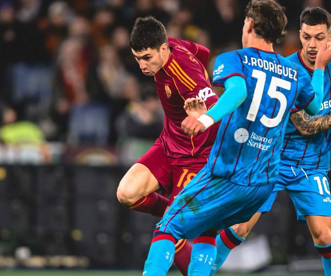 Aksi penyerang AS Roma, Matias Soule (kiri), ketika berusaha melewati hadangan bek Cagliari, Juan Rodriguez (kanan). Selasa, 10 Februari 2026.--Instagram @officialasroma